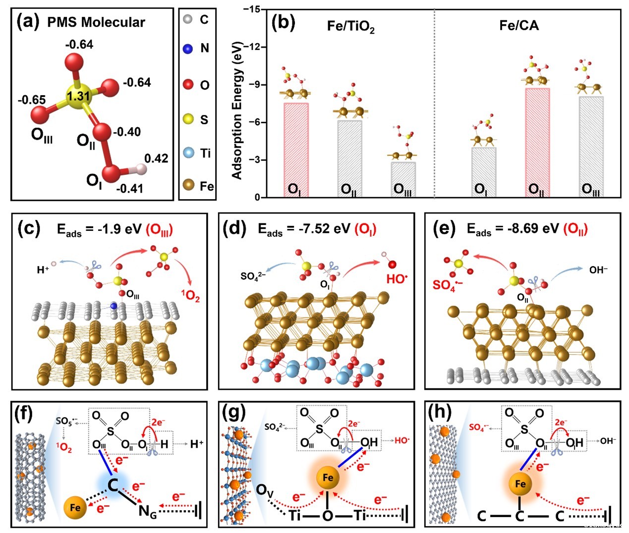 DFT理论计算表明,ROS的选择性生成与阴极活性位点的电子结构有关,它决定了PMS(OIII-S=(O)2-OII-OI-H)中O原子的吸附构型及电子转移方向。当OIII原子吸附并转移电子给Fe/CNT电极上的C位点,选择性生成1O2,此外,当OI和OII原子分别吸附在Fe/TiO2和Fe/CA的Fe位点时,则促使OII-OI键断裂产生HO•和SO4•–。