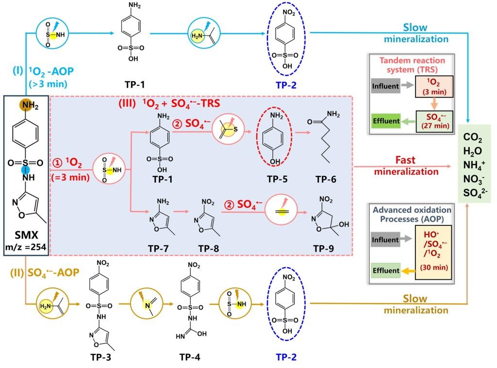 结合理论与实验,探究SMX在1O2+SO4•–-TRS体系的矿化机制:1O2选择性地破坏SMX的磺胺桥(S-N键),生成了对氨基苯磺酸中间体。该中间体极易受到后续SO4•–的攻击,有利于SMX的矿化。TRS体系能够充分利用ROS的反应特性,有效避免难降解中间产物的积累,实现污染物的快速且深度矿化。