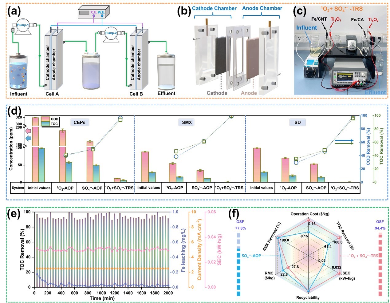 以SMX、磺胺嘧啶(SD)和头孢菌素(CEPs)为主要有机成分的实际抗生素制药废水为处理对象,进一步评估1O2+SO4•–-TRS体系的实际应用潜力。1O2+SO4•–-TRS体系在实际废水处理过程中表现出优异的矿化性能,高稳定性和可持续性,说明其作为一种新型的水处理模式具有较大的应用潜力。