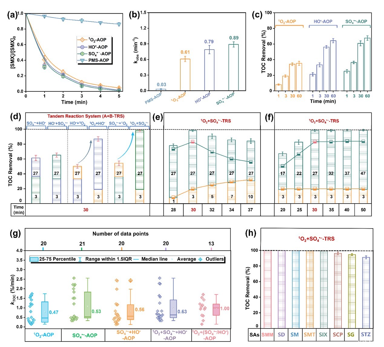实验结果表明,1O2+SO4•–-TRS体系在30 min内可实现磺胺甲恶唑(SMX)的完全矿化,远高于单独的AOP体系。一系列结构相似的磺胺类抗生素在1O2+SO4•–-TRS体系的矿化率均能达到90%-100%,证明了基于结构适配构建的TRS具有广谱适用性。