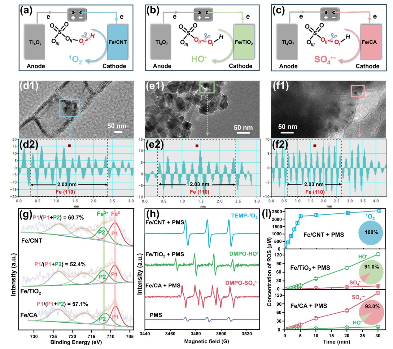 研究团队以碳纳米管(CNT)、商用二氧化钛(TiO2)和碳气凝胶(CA)作为载体分别引入Fe物种,通过电化学平台(保持相同电流和氧化剂用量)活化过硫酸盐(PMS)选择性生成三种经典的ROS(1O2, HO•和SO4•–),为后续的TRS构建提供保障。