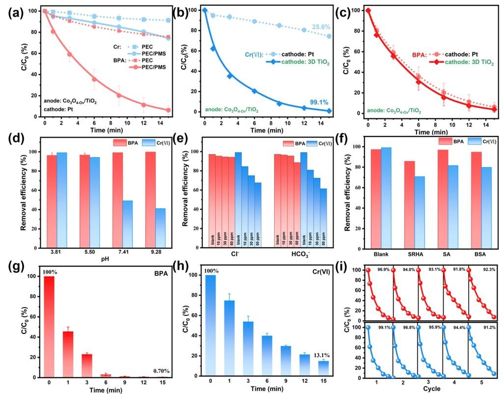 将Co3O4-Ov/TiO₂-PEC/PMS系统应用于模拟废水中BPA和Cr(VI)的同步去除,仅在15min内对BPA和Cr(VI)的去除率分别达到96.2%和99.1%,进一步在实际废水体系中同样表现出优异的去除效果,证实具有良好的实际应用前景。这项工作为水环境中复合污染物的高效同步去除提供了重要的思路。