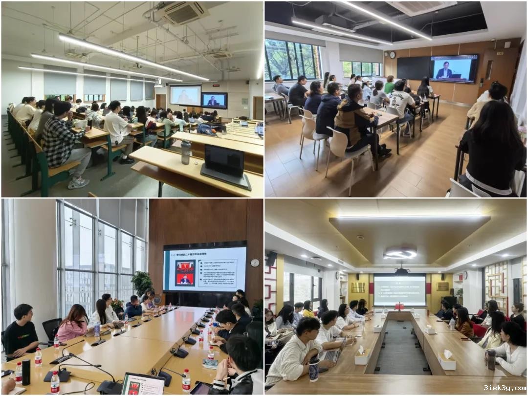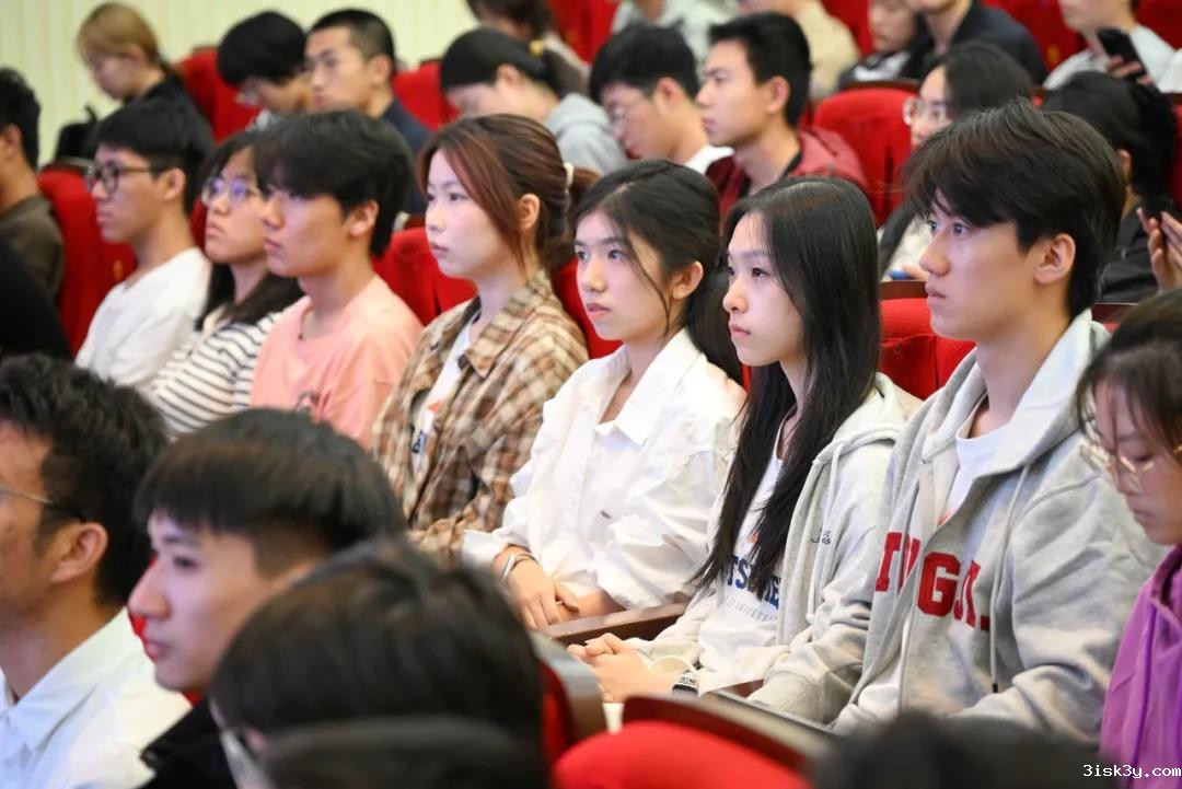 2024级本科新生代表、各学院学生党员代表在四平路校区逸夫楼报告厅听讲,其他学生通过学校流媒体平台聆听。