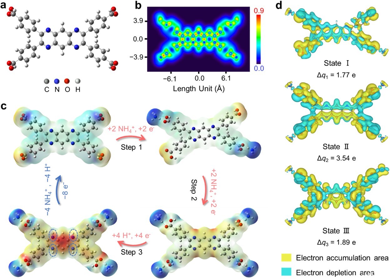 实验表征和理论计算表明:得益于羧基调控的扩展π-共轭氮杂环芳香结构,TBA具有低能带间隙、高电子导电性和低活性位点电荷总和,有助于提高电子转移效率和电极氧化还原速率,赋予TBA快速氧化还原动力学。