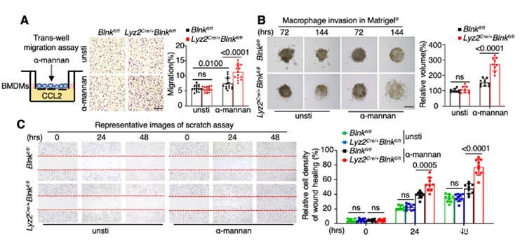 图4.BLNK抑制c-Cbl介导的巨噬细胞迁移负向调控抗真菌免疫
