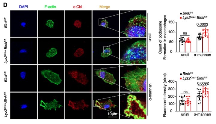 图1.BLNK抑制巨噬细胞伪足小体形成。免疫荧光染色结果显示,真菌多糖刺激后,髓系细胞BLNK条件性敲除小鼠巨噬细胞的伪足小体形成显著增多。