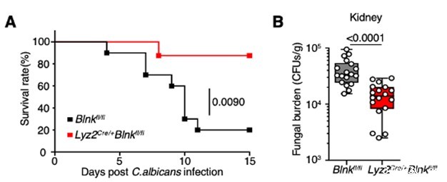 图3.髓系细胞BLNK条件性敲除小鼠在白念珠菌感染过程中,生存率显著上升,肾脏真菌负荷显著降低。