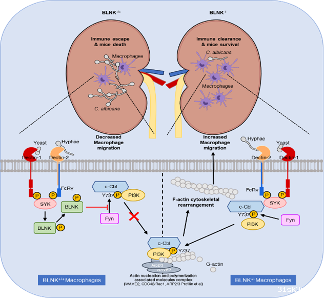 团队研究发现在白念珠菌感染过程中,BLNK通过参与Syk介导的CLR信号激活,影响巨噬细胞的伪足小体形成,从而抑制巨噬细胞迁移,进一步负向调控宿主的抗真菌免疫反应。