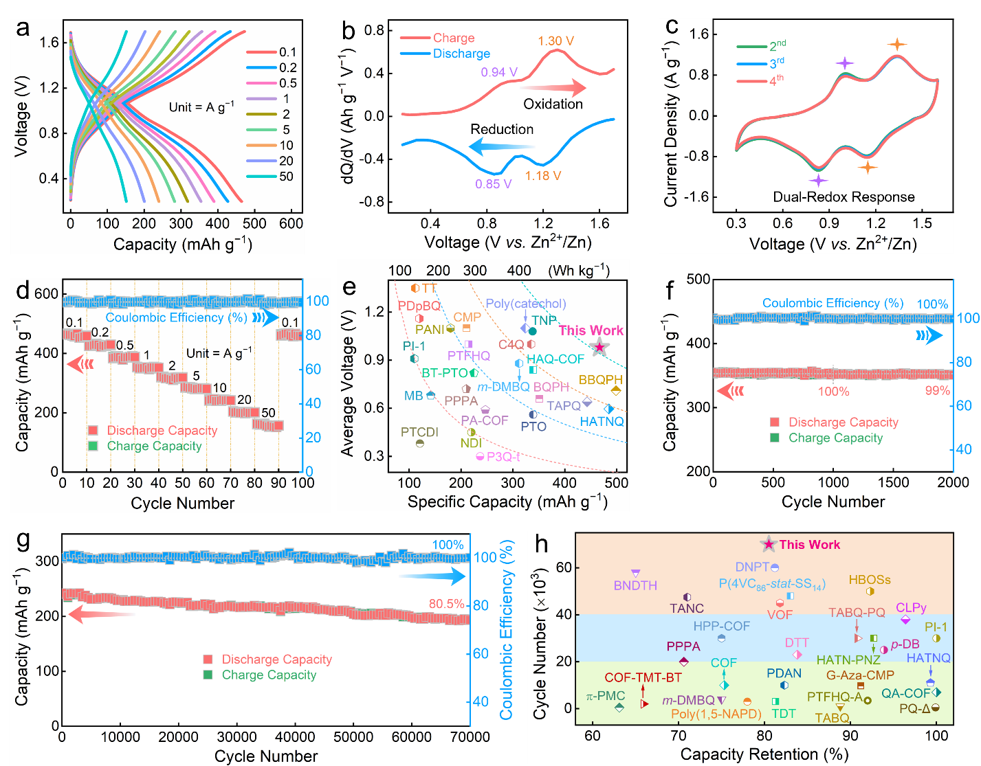 有机超结构正极材料用于水系锌-有机电池时,表现出高比容量(465 mAh g−1@0.1 A g−1)、超高能量密度(412 Wh kg−1)和优异的循环稳定性(70,000次充放电后容量保持率为80.5%)。