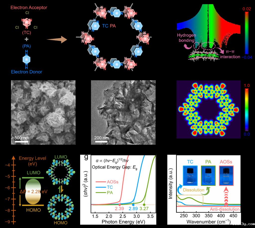 课题组研究显示,电子受体三聚氯氰和电子给体哌嗪通过氢键和π−π平面堆叠自组装形成花状有机超结构,展示出高密度活性位点、高度共轭的双极性结构和低能带间隙,有助于加快电子转移动力学和电极氧化还原速率。