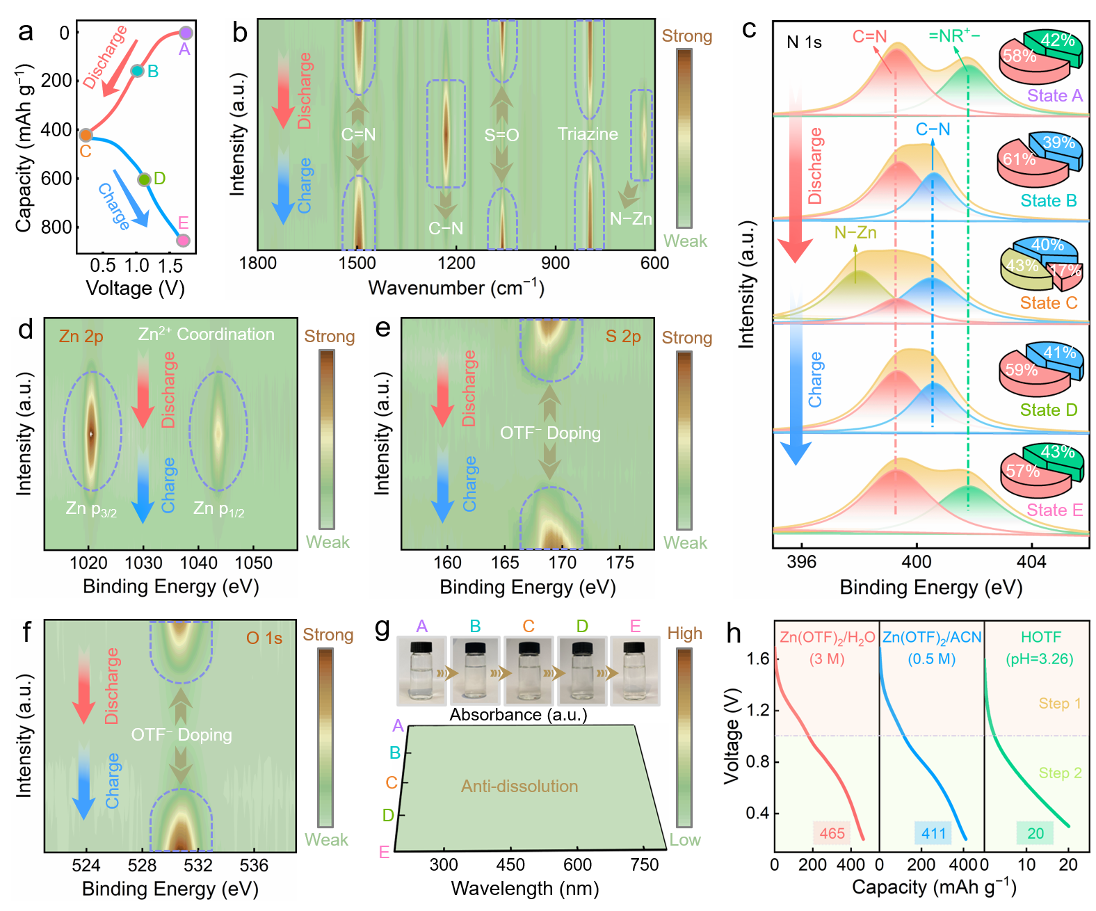 研究人员通过异位光谱研究,表明亚胺/叔氮作为有机超结构的n型和p型电活性中心,分别与Zn2+和OTF−电荷载体反应,引发高度可逆的连续阴/阳离子共配位反应。