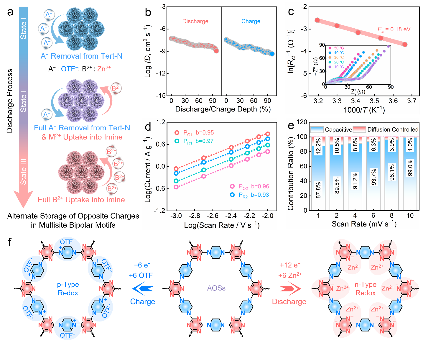 动力学分析和活化能计算表明,有机超结构实现了低反应能垒的Zn2+/OTF−相反电荷交替配位过程,有效消除了相同离子间库伦斥力影响,促进了稳定和快速的两步18e−氧化还原能量存储过程。这项工作为通过活性位点和微结构协同设计提高有机材料储能性能提供了新的视角。