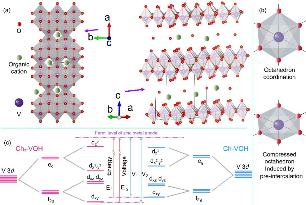 提高阴极的工作电压是提高二次电池能量密度的关键。化学配位通过影响正极材料中氧化还原阳离子d轨道的能级来影响工作电压。与以往着重于提高比容量的研究不同,本研究以V2O5·nH2O为模型,通过局部化学配位操作来调节d轨道能级,从而使锌离子电池具有更高的工作电压。并借助先进表征技术解读阴极材料中化学配位与工作电压之间的关系。该项工作解析的电池工作电压决定因子,在不牺牲阴极材料比容量的同时,提高其工作电压,为可充电电池能量密度的提高提供了新的策略。