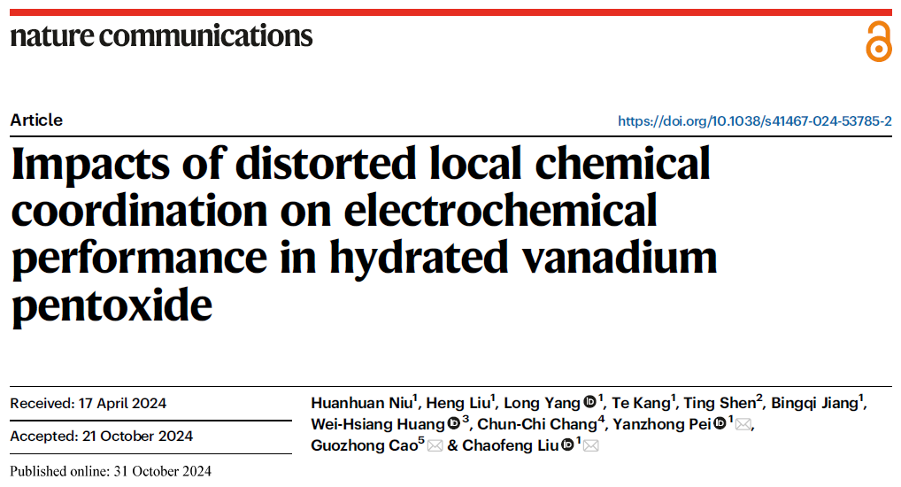 10月31日,《自然·通讯》(Nature Communications)在线发表了材料科学与工程学院裴艳中教授团队刘超峰特聘研究员的论文“Impacts of Distorted Local Chemical Coordination on Electrochemical Performance in Hydrated Vanadium Pentoxide”。