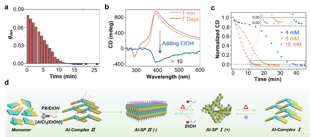 不同的是,在对二甲苯/乙醇(v:v=99:1)溶剂中形成的Al(III)/PVPCC组装体系中,Al-SP I与Al-SP II的转变及其手性反转遵循的是一种连续性组装的调控机制。研究结果表明,这主要基于溶剂乙醇分子可与Al3+配位,并作为构筑基元参与手性组装所致。