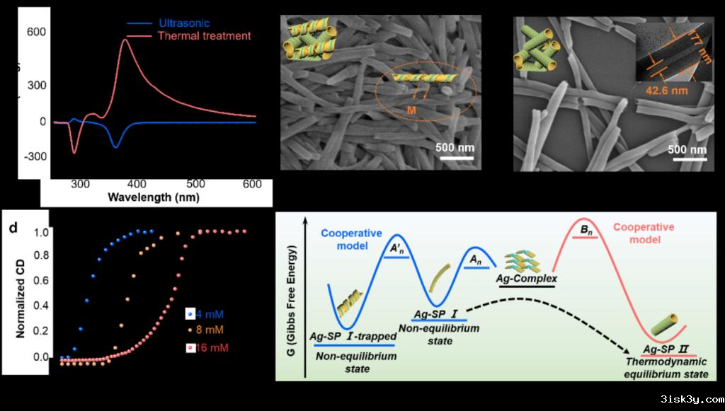课题组研究发现,利用Ag+或Al3+与PVPCC共组装时,可以形成具有不同组装路径的超分子组装体。其中,在Ag+与PVPCC的组装体系中,金属复合物Ag(I)/PVPCC在对二甲苯与正丁醇(v:v=1:1)的混合溶剂中,首先组装成动力学稳定的一维纳米纤维,宏观上表现为自支撑的超分子凝胶(记作Ag-SP I)。随后在银-银金属相互作用驱动下,逐渐转变为热力学稳定的螺旋纳米管(记作Ag-SP II),宏观上为凝絮状分散液。整个过程表现出圆二色谱(CD)和圆偏振发光(CPL)信号的动态反转现象。进一步通过热处理,可以实现Ag-SP II与Ag-SP I组装态及手性光学信号反转的循环控制。此外,研究小组还通过变温CD光谱证实了Ag-SP I和Ag-SP II的形成都遵循着成核‒生长的协同组装模式,同时揭示了竞争性组装路径调控这两种组装体之间的动态转变和手性反转的调控机制。