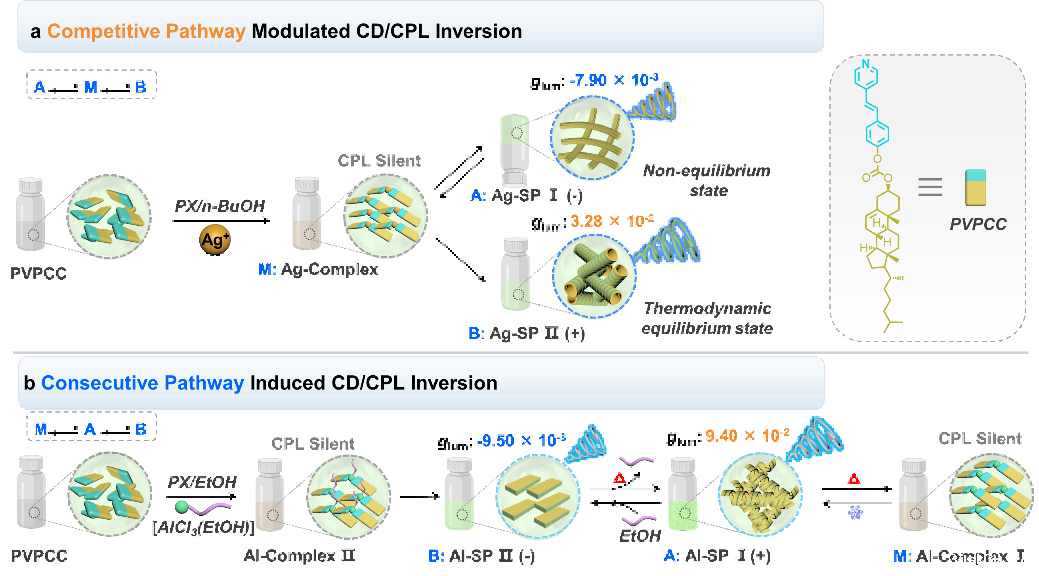 化学科学与工程学院刘国锋课题组一直致力于多层次手性传递机制及超分子动态材料的研究,近期构建了一种基于吡啶甾醇化合物(PVPCC)与金属离子(Ag+或Al3+)的手性组装体系,揭示了竞争性和连续性组装路径调控超分子组装体手性的动态反转的作用机制,并实现了组装体多态性的循环切换及其圆偏振发光(CPL)性能的动态调控,为动态手性超分子材料的构建开辟了新的途径。相关成果以“Pathway-directed recyclable chirality inversion of coordinated supramolecular polymers”为题发表于国际权威期刊《自然·通讯》(Nature Communications)。