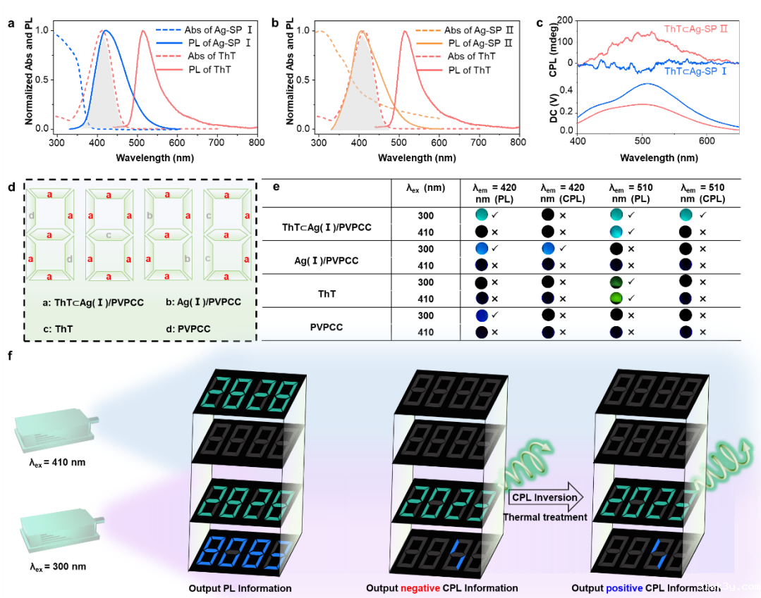 最后,研究小组利用Ag(I)/PVPCC组装体系CPL动态反转的性质,结合共振能量转移策略,将硫黄素T(ThT)与Ag(I)/PVPCC共组装,构筑了ThT⊂Ag(I)/PVPCC超分子组装体系,并展示了该系统在动态CPL加密方面的潜在功能。