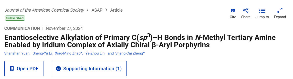 三级胺在医药及催化领域有着广泛应用。众多阿片类镇静剂药物都含三级胺的主体结构,如芬太尼、吗啡与尼古丁等药物。对该类药物的N-甲基位直接修饰获着更具活性及抗耐药性的单一手性构型新药,有着更强的目标性及经济性,是科学家一直以来的追求目标。近日,化学科学与工程学院郑生财研究员和赵晓明教授研究团队利用其团队开发出的原创轴手性卟啉作为配体,辅助金属铱催化剂对含甲基三级胺类化合物实现了特异性的选择不对称催化。构建出众多含β-手性的三级胺。相关研究成果以“Enantioselective Alkylation of Primary C(sp3)–H Bonds in N-Methyl Tertiary Amine Enabled by Iridium Complex of Axially Chiral β-Aryl Porphyrins”为题在线发表于国际知名期刊《美国化学会志》(Journal of the American Chemical Society)。
