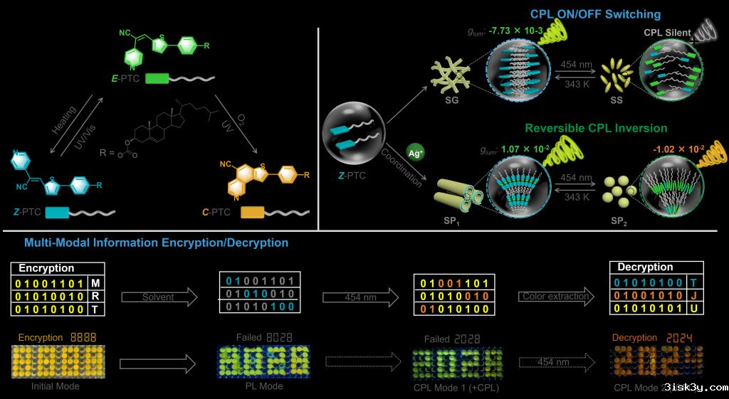 近期,化学科学与工程学院刘国锋特聘研究员课题组设计了一种创新的光响应分子——吡啶噻唑丙烯腈-胆固醇衍生物(Z-PTC)。通过引入银离子(Ag⁺)的配位作用,该团队成功驱动了手性组装,构建出一种能够在光照条件下调控CPL信号进行可逆反转和发射颜色切换的超分子结构。这一系统不仅在半固态环境中展示了复杂的信息加密/解密功能,还为高级信息加密技术开辟了新的可能性。相关研究成果以“Reversible Circularly Polarized Luminescence Inversion and Emission Color Switching in Photo-Modulated Supramolecular Polymer for Multi-Modal Information Encryption”为题发表于国际知名期刊《美国化学会志》(Journal of the American Chemical Society)。