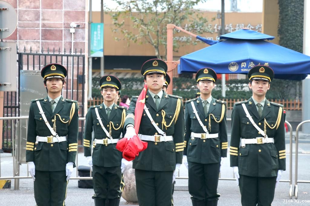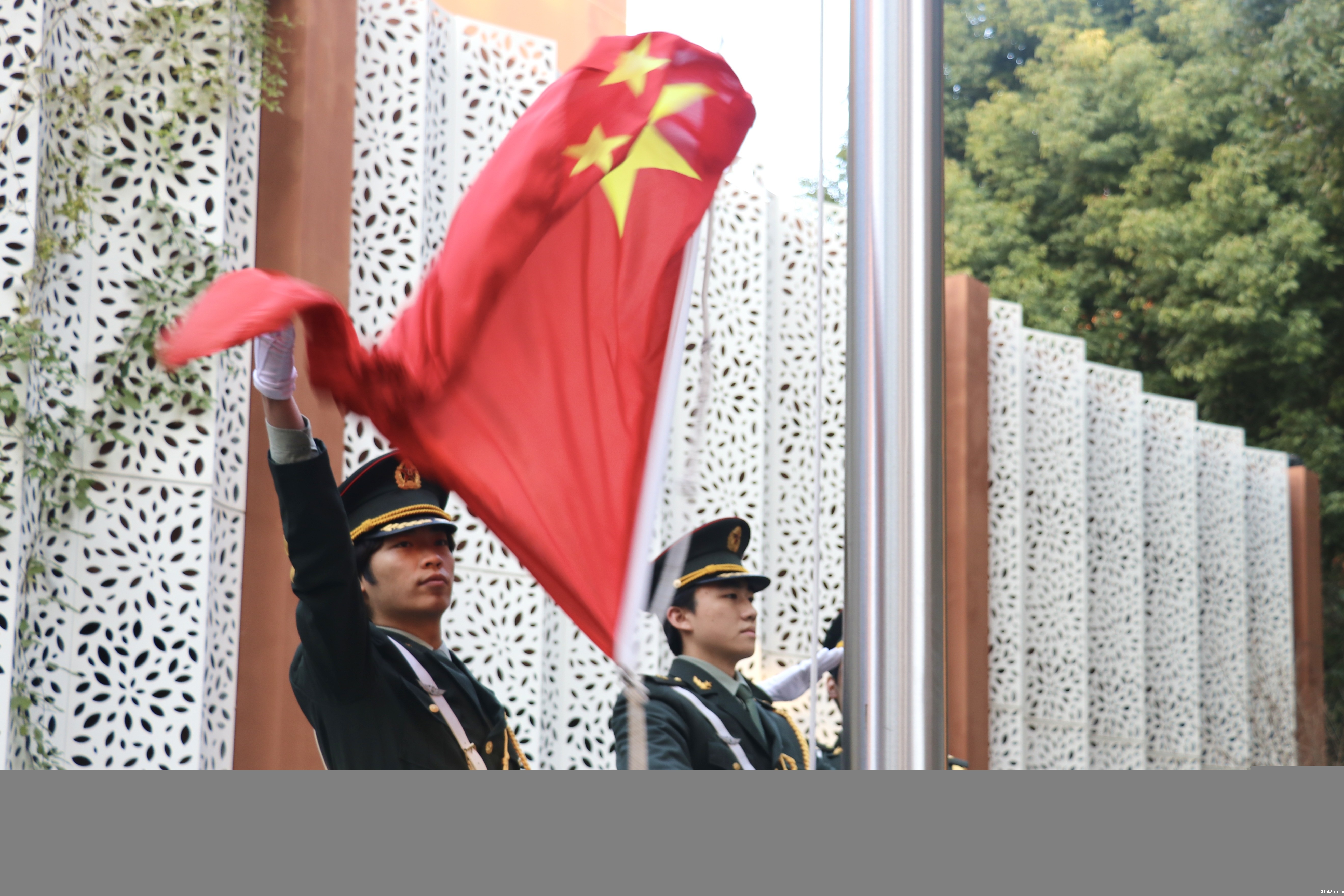 国旗护卫队正步铿锵有力、整齐划一,护送五星红旗至升旗台前。伴随着庄严的《义勇军进行曲》奏响,五星红旗在全体师生注视下缓缓升起