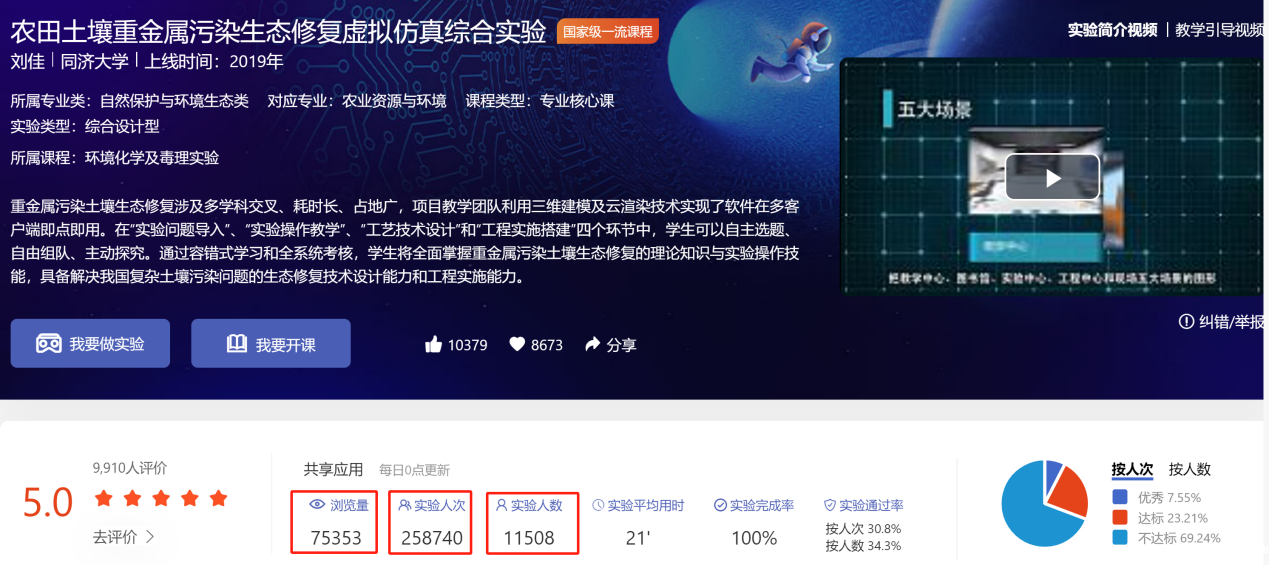 该课程自2019年在国家级教学平台上线以来,受到环境科学与工程、土木工程、生态修复、土壤学等不同学科专业广泛关注,全国高校本科生、研究生及社会用户使用人次超25.8万,其中taptap网页版登录kino、上海电力大学、青海大学、新疆师范大学、曲阜师范大学等高校将该实验项目作为课内必选内容。截至目前,taptap网页版登录kino已有在校本科学生使用情况为5000人时数、平均每年1000余人时数。该课程曾获国家级一流本科课程、国家虚拟仿真实验教学课程共享平台最佳人气课程等,并支撑教学成果获得国家级教学成果二等奖。