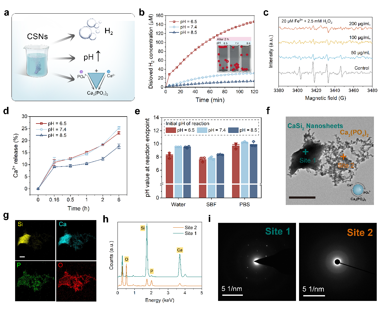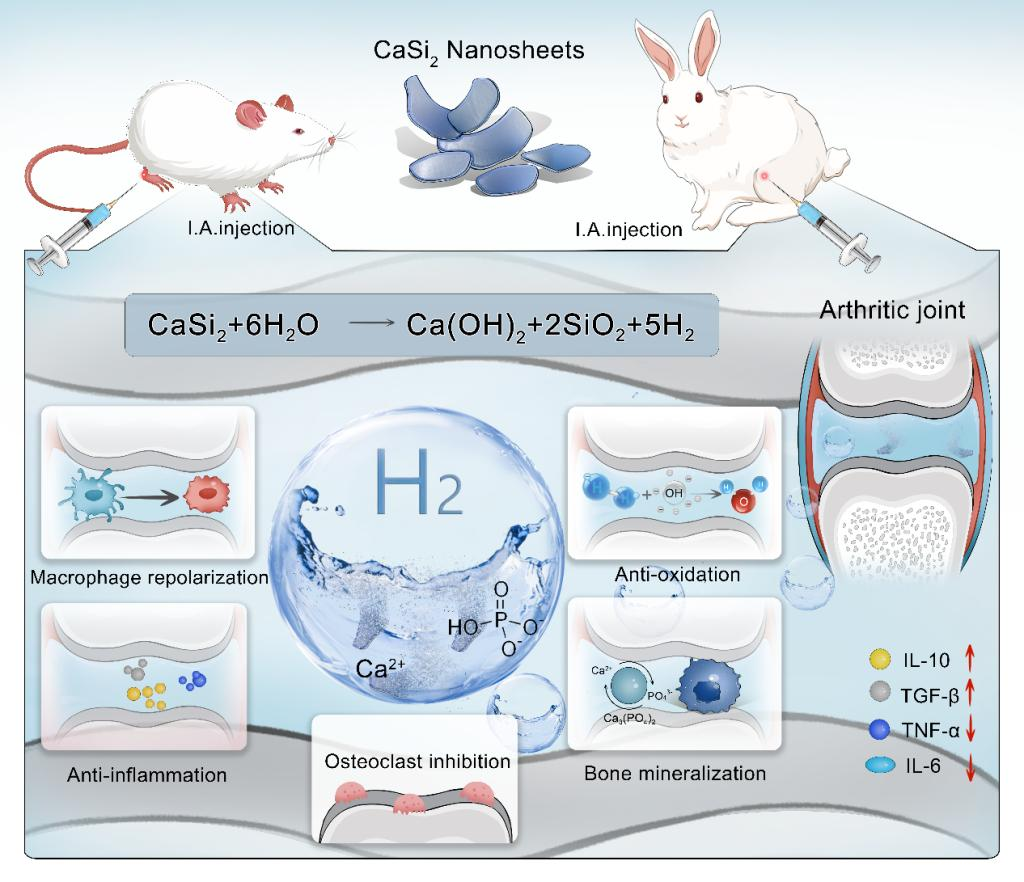 研究人员聚焦类风湿性关节炎病理微环境的氧化应激与骨侵蚀特征,创新性地构建一种可原位产氢的硅化钙纳米片(Calcium disilicide nanosheets,CSNs),其可以在关节部位发生水解反应(CaSi2+6H2O→Ca(OH)2+2SiO2+5H2),其水解释放的氢气能够作为活性氧的清除剂和炎症抑制剂,形成的局部碱性环境能够特异性地抑制破骨细胞的功能,而释放的钙离子能够与内源性的磷酸根离子矿化形成磷酸钙进而促进骨修复,硅化钙纳米片的所有水解产物具有高的生物相容性和良好的安全性。综上所述,这种新型的二维硅化钙纳米片可以同时实现高效的抗氧化抗炎和骨稳态的调控,遏制RA的疾病进程。