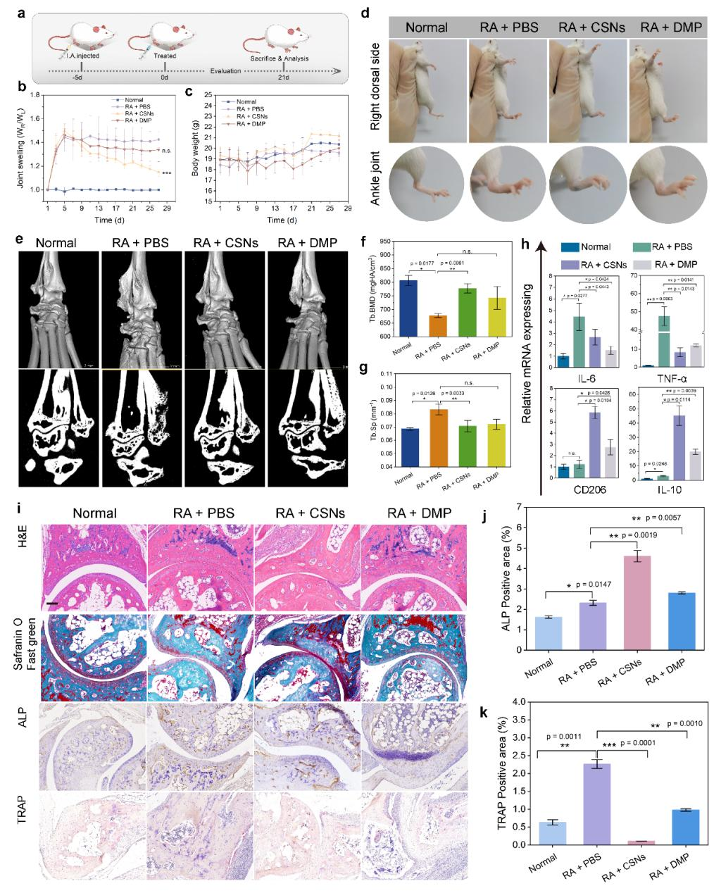 图6.硅化钙纳米片在小鼠关节炎模型上的治疗验证