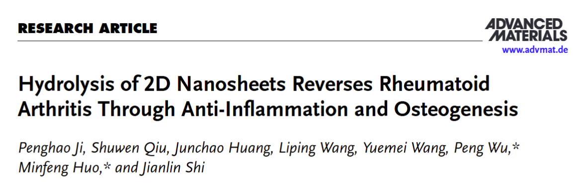 类风湿性关节炎(Rheumatoid arthritis,RA)是关节炎症的一种主要发病形式,是一种自免疫紊乱引起氧化应激和慢性炎症的关节疾病。近年来,我国RA的患病率大约在0.4%左右,而伴随着人口的老龄化,这一数字还在逐年上升。由于慢性疼痛、功能障碍和合并症风险的逐渐加剧,RA严重影响患者的生活和工作质量,给个人和社会带来严重的经济负担。值得注意的是,骨侵蚀是RA导致关节破坏引起患者致残致畸的主要因素。目前,临床上针对RA一般采用消炎疗法,主要有糖皮质激素类和非甾体抗炎药,以甲氨蝶呤为代表的经典抗风湿药物和单克隆抗体类药物。然而,这些药物不可避免地存在严重的毒副作用,且缺乏直接对关节骨修复的治疗。因此,设计和开发适用于RA综合治疗的新型安全药物和治疗策略迫在眉睫。2024年12月26日,taptap网页版登录kino医学院霍敏锋研究员、施剑林院士、吴鹏副教授研究团队在《先进材料》(Advanced Materials)期刊上发表了题为“Hydrolysis of 2D Nanosheets Reverses Rheumatoid Arthritis Through Anti-Inflammation and Osteogenesis”的研究论文,提出“二维纳米片原位水解治疗RA炎症和骨修复”新策略。