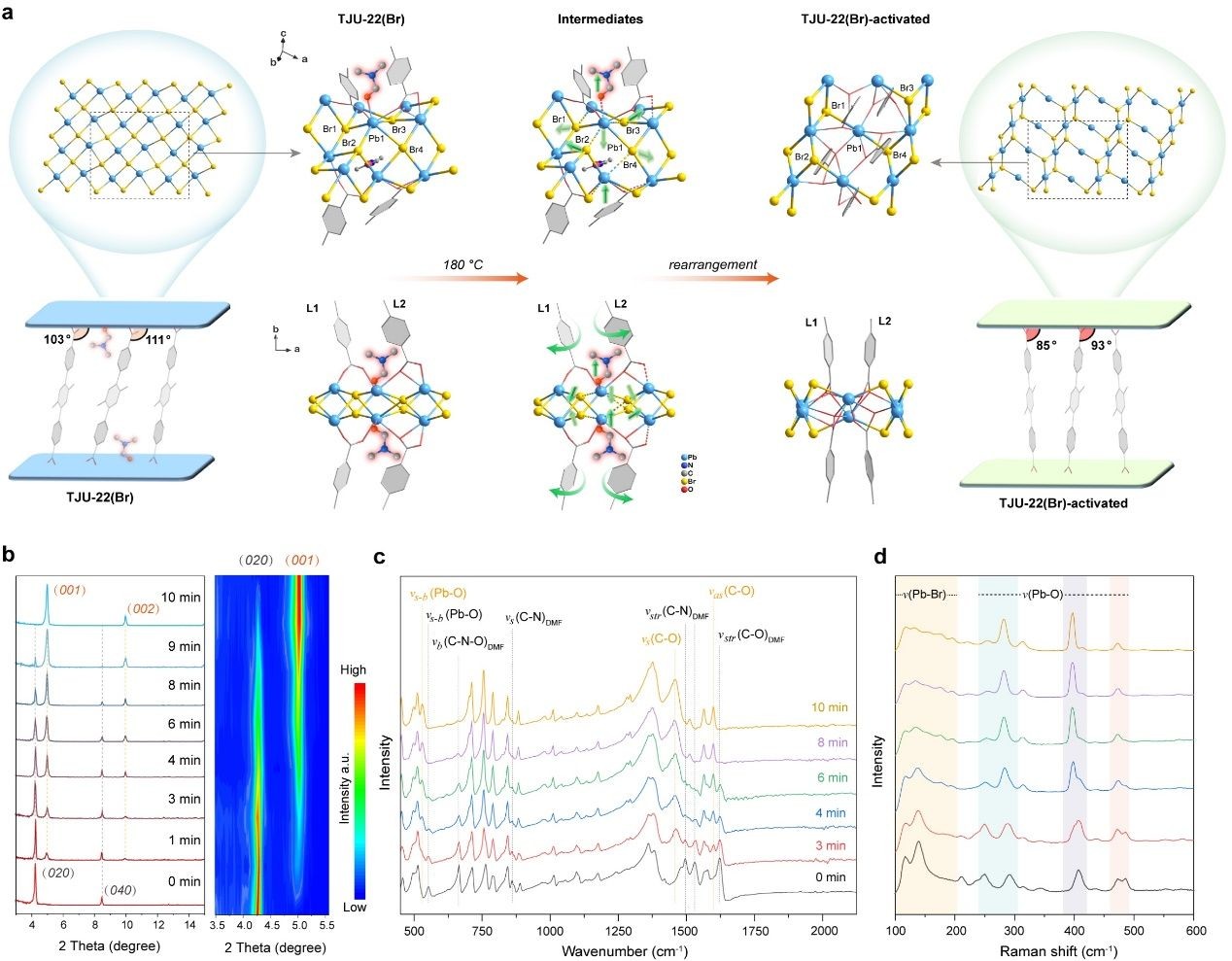 图2. 热活化导致的 TJU-22(Br)溴化铅层结构变化示意图以及TJU-22(Br)在活化过程中随时间变化的原位XRD、FT-IR和Raman光谱图