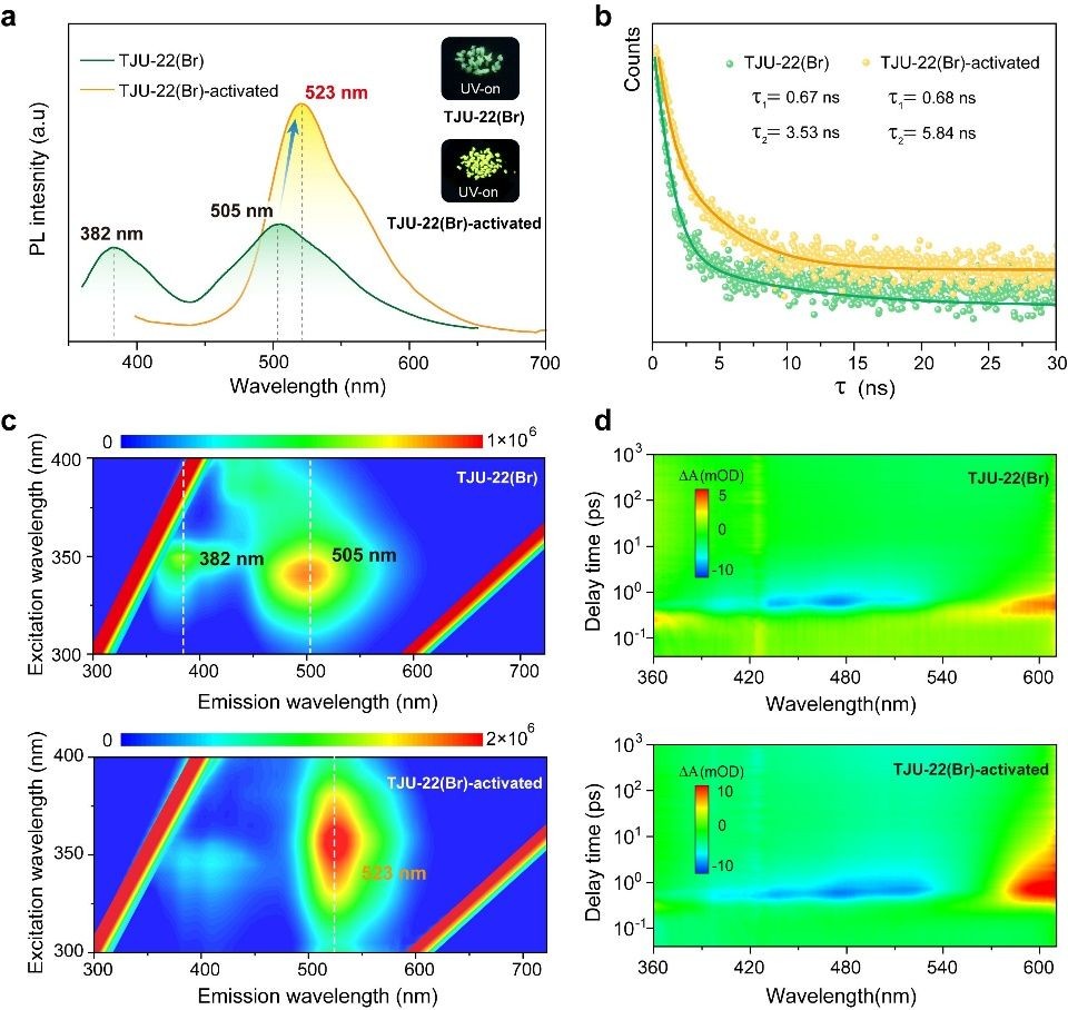 图3. TJU-22(Br)活化前后自陷态发光及瞬态吸收光谱比较