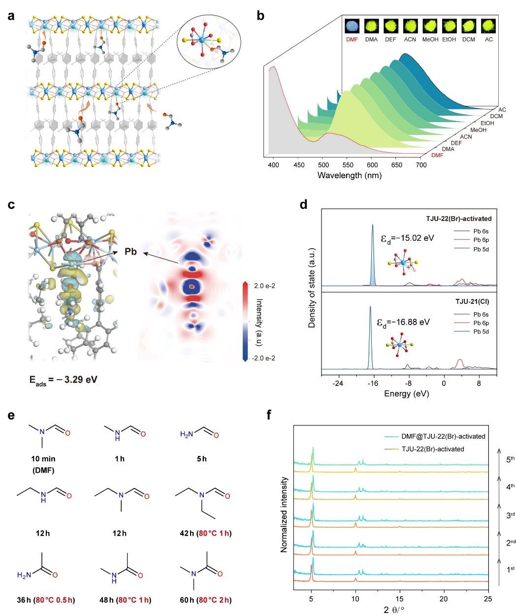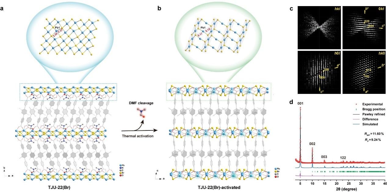 设计合成的TJU-22(Br)中一半的Pb2+中心与层间末端DMF分子的氧单齿相连,形成共价Pb−O键。这一独特的末端溶剂配位的有机卤化物配位结构为构建基于有机卤化铅杂化物的配位不饱和金属位点提供了一个潜在的平台。通过3D-EDT技术对热活化后离去DMF分子的结构TJU-22(Br)-activated进行了精确的表征。