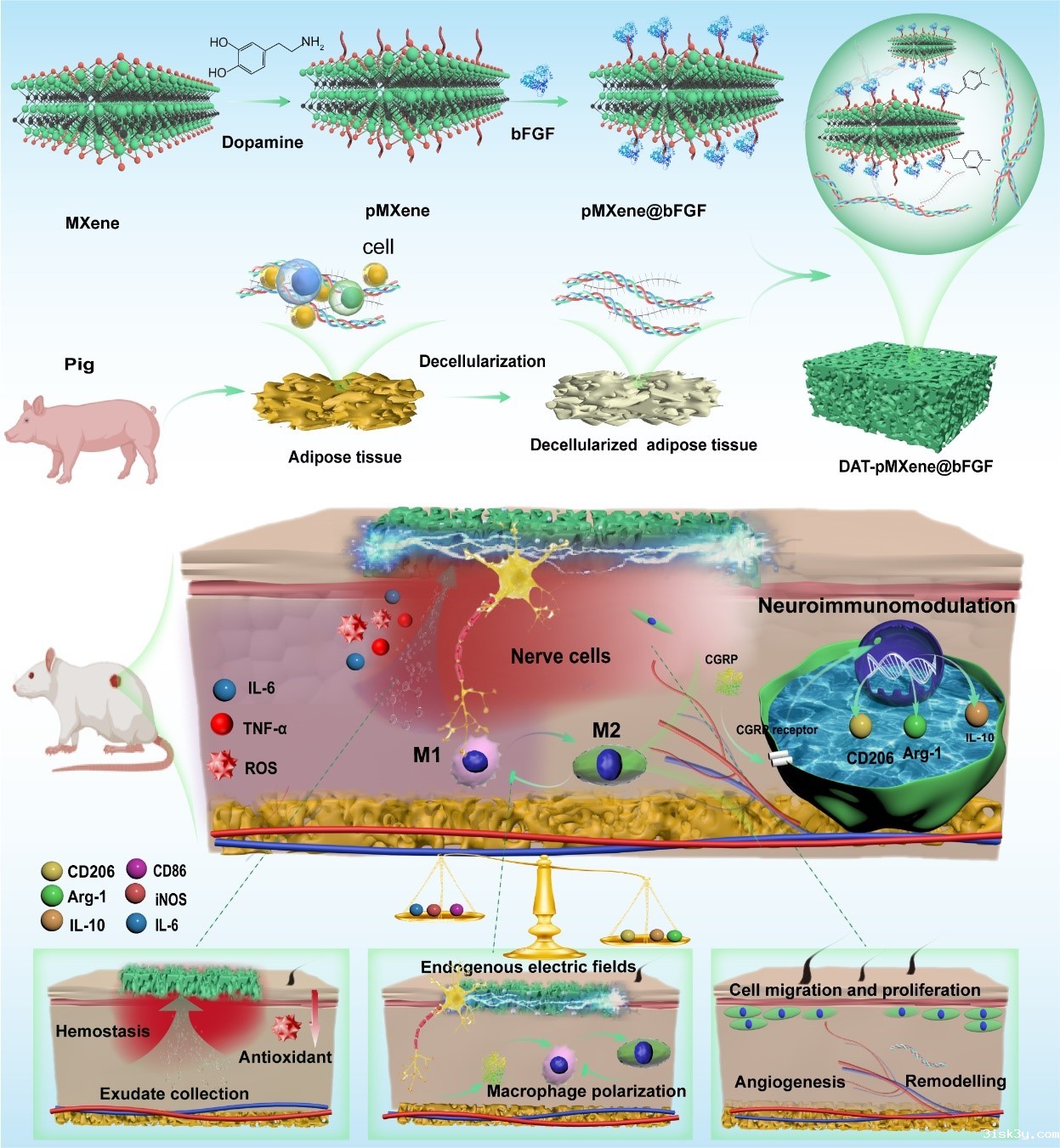 该研究受皮肤组织的电生理环境和结构的启发,提出了一种基于MXene的DAT支架(一种仿生神经免疫调节系统,即BNIR系统)用于增强糖尿病性伤口愈合。该研究中,聚多巴胺修饰的MXene具有显著的稳定性和抗氧化性能,同时保持其导电性。PDA涂层能够有效地连接成纤维细胞生长因子(bFGF)。此外,通过冷冻干燥技术构建了一个3D DAT海绵支架,旨在处理伤口渗出液和止血。pMXene@bFGF赋予了3D DAT海绵支架导电性、抗氧化性能和提供了生物活性因子。在体外实验中,BNIR系统不仅表现出良好的生物相容性,还显著促进细胞增殖、血管生成和迁移。BNIR系统通过神经免疫调节诱导M1巨噬细胞向M2巨噬细胞的转变。此外,通过糖尿病大鼠模型系统地研究了复合支架加速糖尿病性伤口愈合的潜力。BNIR系统实现了伤口有效的愈合,展示了聚集伤口渗出液、耦合内源EFs、神经免疫调节、清除ROS和传递bFGF在加速糖尿病性伤口愈合方面的治疗益处。最后,BNIR系统对于再生其他电敏感组织,包括心脏、骨组织等,也具有重要的潜力。