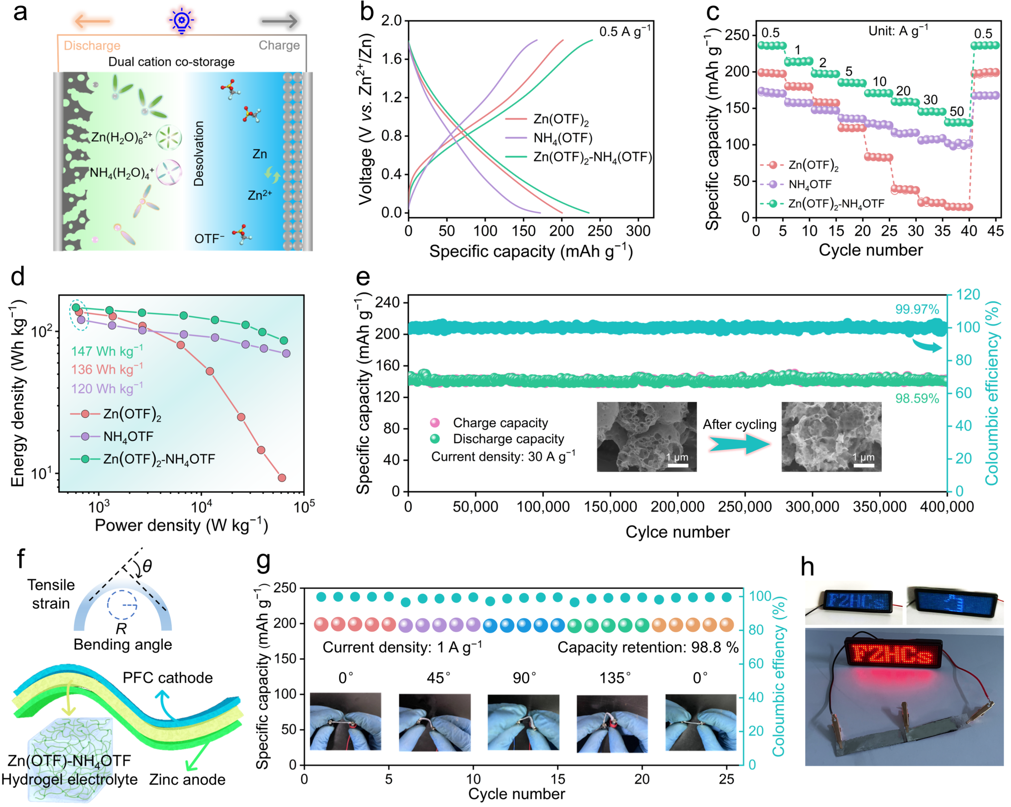 电化学性能研究表明,锌离子混合电容器在Zn(OTF)2–NH4OTF电解液中展示出高容量(240mAhg−1@0.5Ag−1)、高倍率性能(130mAhg−1@50Ag−1)和超长循环寿命(400,000次充放电后容量保持率为98.59%)以及优异柔性(0−180°内任意弯曲)。