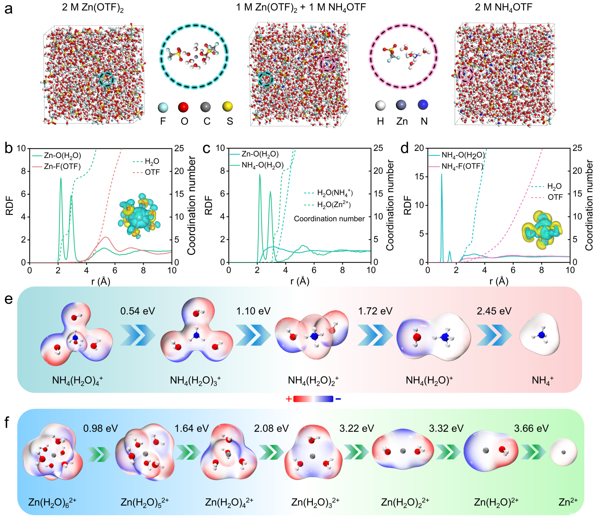 分子动力学模拟证实,Zn2+和NH4+分别形成Zn(H2O)62+和NH4(H2O)4+溶剂化结构,其中NH4+具有更低脱溶剂化能垒,提供更高效的离子键合动力学。
