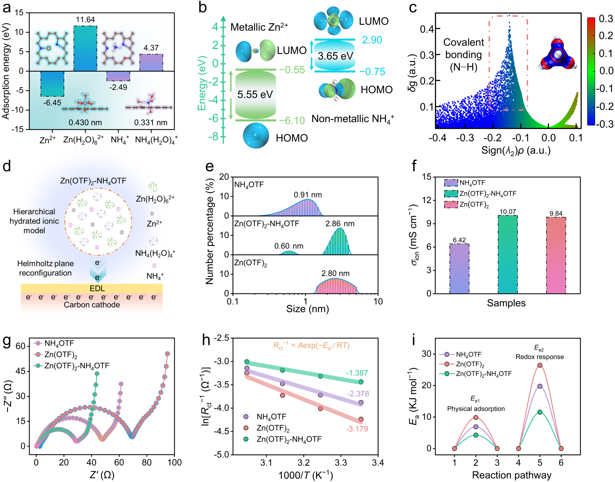理论计算和实验表明,在Zn(OTF)2–NH4OTF混合电解液中,Zn2+展现出高反应活性,NH4+具有低反应能垒,两者协同实现快速和稳定的界面反应动力学。