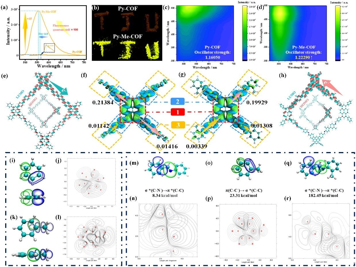 将σ-π超共轭引入COFs已被证明可以显著增强它们的荧光特性。实验研究表明,包含超共轭结构的COFs表现出明显更高的荧光强度和量子产率,相比于它们不包含超共轭结构的对应体。光物理研究揭示了σ-π相互作用降低了激发态跃迁的能垒,促进更有效的辐射复合并延长荧光寿命。理论分析进一步支持了这些发现,显示超共轭结构重新分配了电子密度并改变了COFs的电子结构。这种修改增强了电子耦合并促进了骨架内更有效的能量传递,从而实现了更优越的荧光性能。这些观点不仅推动了对COF光物理学的理解,也将超共轭结构定位为设计具有可调性能的先进发光材料的强有力策略。