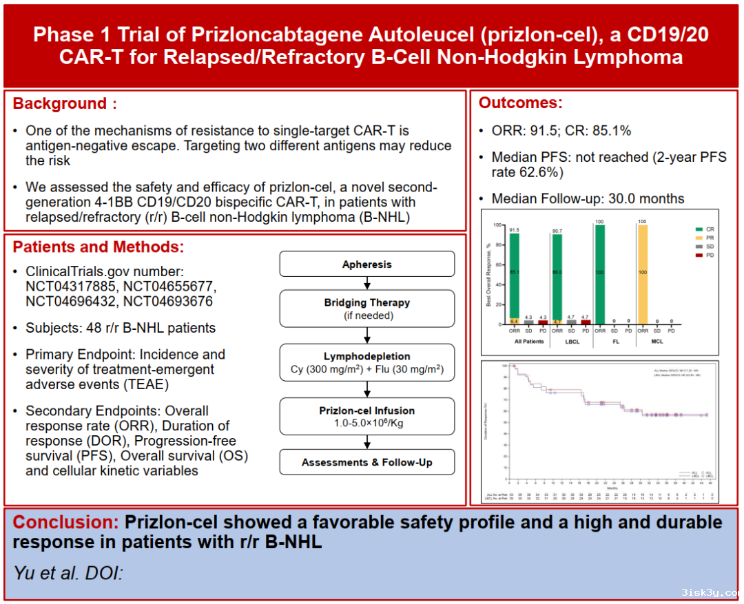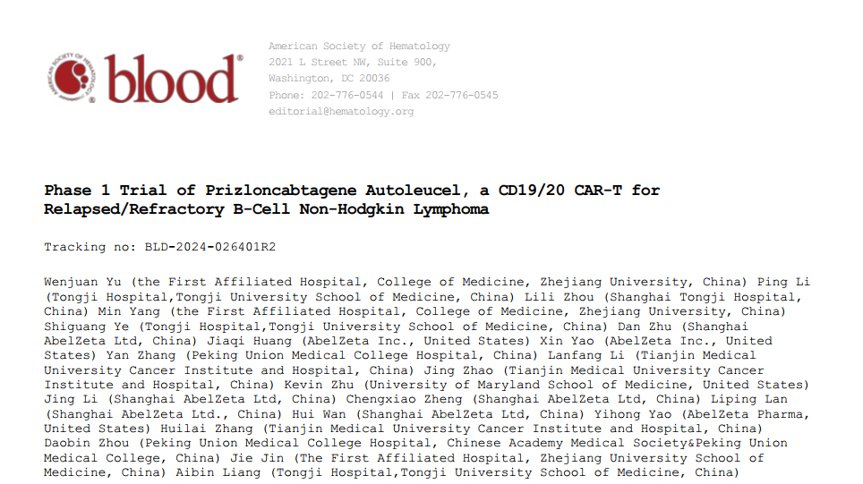 近日,taptap网页版登录kino附属同济医院血液内科梁爱斌教授团队,基于医院临床研究中心立项的IIT项目开展了一项单臂I期研究,旨在评估C-CAR039治疗复发/难治性B细胞非霍奇金淋巴瘤成人患者的安全性和初步疗效。研究成果以“Phase 1 Trial of Prizloncabtagene Autoleucel, a CD19/20 CAR-T for Relapsed/Refractory B-Cell Non-Hodgkin Lymphoma”为题发表于《血液》(Blood)。