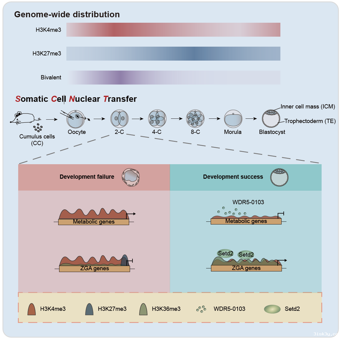 该研究首次绘制了小鼠核移植胚胎发育过程中组蛋白H3K4me3和H3K27me3修饰的动态变化图谱,揭示了这两种修饰在全基因组水平及启动子区的修饰异常。研究发现,与自然受精胚胎相比,核移植胚胎在合子基因激活期(zygotic genome activation,ZGA,发生在小鼠植入前胚胎2-细胞期),组蛋白H3K4me3和H3K27me3修饰在启动子区均出现了异常的过度富集。通过在核移植胚胎中加入组蛋白H3K4me3修饰的小分子抑制剂WDR5-0103,显著提高了核移植胚胎的囊胚率和植入率,同时成功修复了因H3K4me3过度建立而引起的基因表达异常。