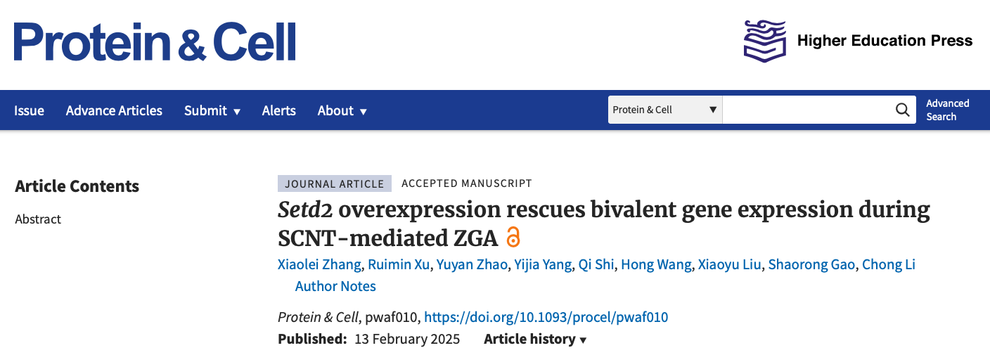 生命科学与技术学院高绍荣团队揭示异常的组蛋白二价修饰对体细胞核移植胚胎合子基因激活过程产生影响的机制,成果发表于《蛋白质与细胞》