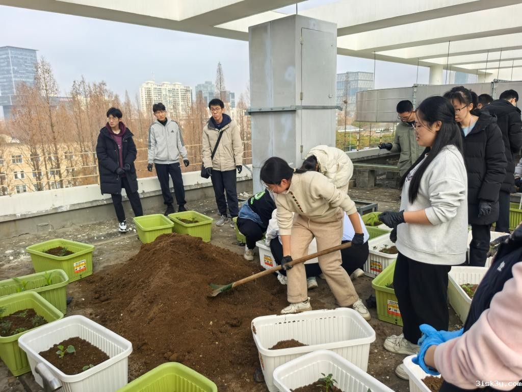 3月11日,在四平路校区,近40名学子齐聚新落成的魔肥“碳”索工坊屋顶菜园,开启一场别开生面的春日耕种之旅。活动现场,爱卫办负责老师给同学们介绍了湿垃圾就地资源化处置示范基地的基本情况,并讲解了食堂湿垃圾原位资源化处理产物作为营养土供给校园绿化使用的“绿色生态循环之旅”,让同学们对垃圾分类和湿垃圾资源循环有了更清晰具体的认识。随后,资深园艺师为同学们讲解各种蔬菜的习性、栽培要点,指导同学们动手翻土、种植、浇水。大家兴致勃勃地开始栽种,并为辣椒、玉米、丝瓜、豆角等蔬菜标上了各具特色的生长标识。这些蔬菜幼苗将在西苑屋顶菜园的阳光雨露中蓬勃生长,并最终由同学们亲手采摘,化作食堂餐盘里绿色健康的时令佳肴。