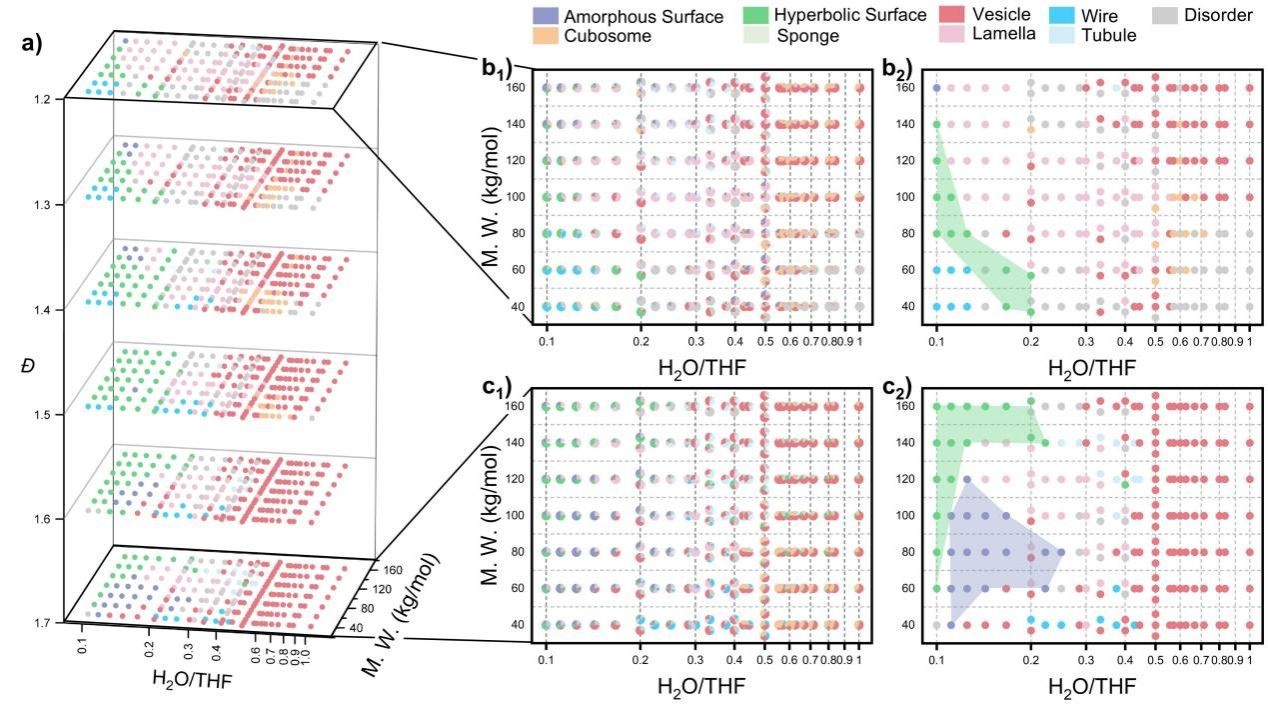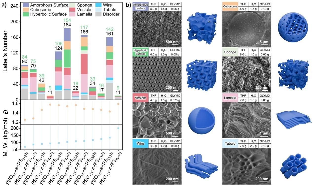 近日,化学科学与工程学院韩璐教授团队应用深度学习技术来辅助理解杂臂星型嵌段共聚物PEO-s-PS2在蒸发诱导自组装体系中的相行为,成功预测了三维合成相图,并挖掘了合成参数与最终结构之间的关系,相关研究成果以“Deep-learning-assisted understanding of the self-assembly of miktoarm star block copolymers”(基于深度学习的杂臂星型嵌段共聚物自组装行为解析)为题发表于《美国化学学会·纳米》(ACS Nano)。