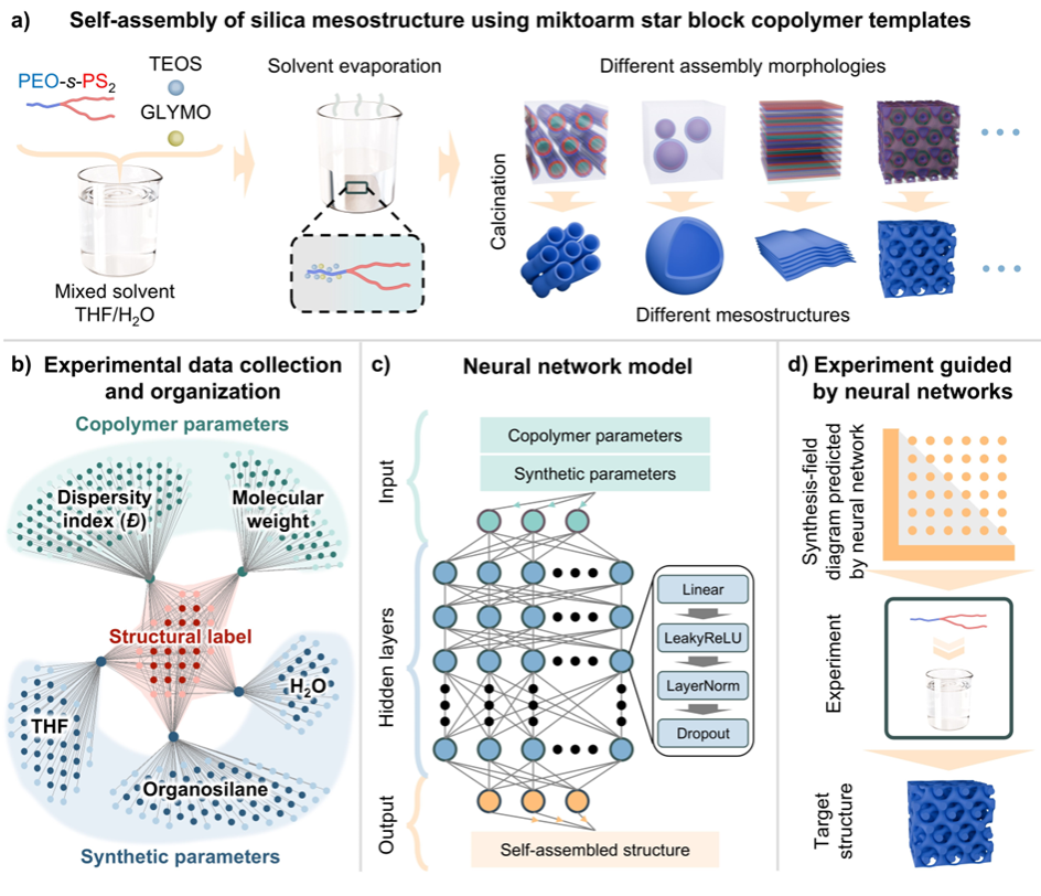 在此项研究中,构建了一个基于多层感知器(MLP)的深度神经网络模型,用于预测杂臂星型嵌段共聚物在无机前驱体参与的蒸发诱导自组装体系中的复杂相行为。以聚环氧乙烷-s-聚苯乙烯2(PEO-s-PS2)为模板分子,在四氢呋喃/水(THF/H2O)混合溶剂中与正硅酸四乙酯(TEOS)和3-缩水甘油醚氧基丙基三甲氧基硅烷(GLYMO)进行共缩合实验,构建了包含802组样本的训练数据集。数据集以嵌段共聚物的分子量(M.W.)、分散指数(Ð)及反应体系中H2O、THF、GLYMO的添加量作为输入参数,通过结构标签标记的最终介观结构作为输出目标。该模型通过学习数据集中的隐藏模式,成功建立了从合成参数到介观结构的非线性映射关系,能够预测指定合成条件下各类型结构被合成的概率,并绘制合成相图以揭示隐藏的自组装规律。