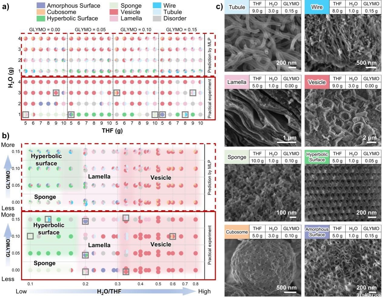 使用训练好的MLP遍历合成参数构建了不在数据集中的杂臂星型嵌段共聚物的合成相图(a和b中的虚线框),并且通过实际实验对其进行验证(a和b中的实线框)。实验相图与MLP预测得到了一致的结构转变路径,验证了在该合成体系中,神经网络捕获到了变量与最终结构之间的隐含关系。这种能力对于理解自组装过程的相行为至关重要。
