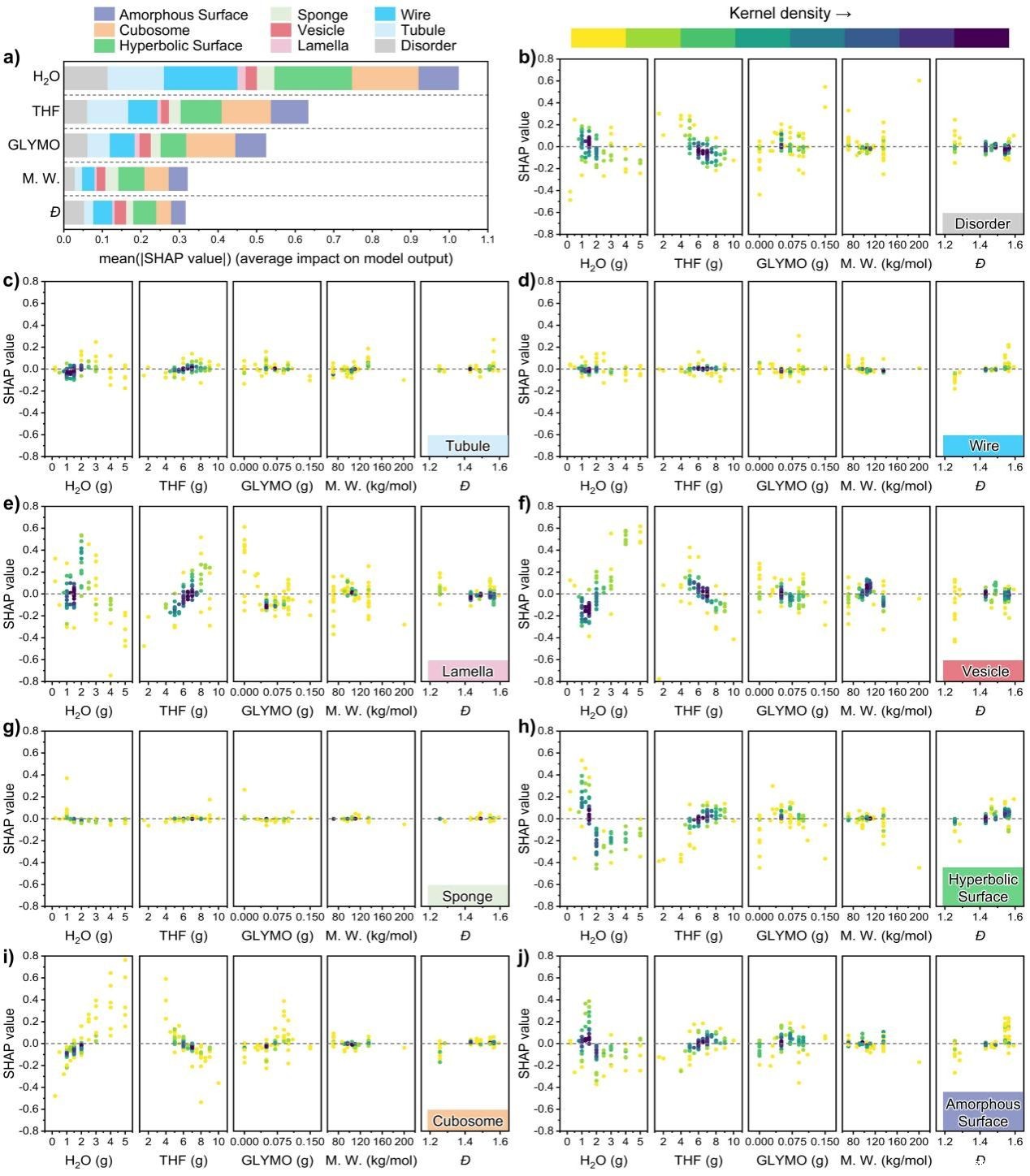 将聚合物的分子量和分散指数进一步加入探索范围,MLP能够在2分钟内完成合成相图预测(a)。b和c展示了不同分子量和H2O/THF质量比时聚合物分散指数为1.2和1.7的杂臂星型嵌段共聚物的二维合成相图。通过提取每个饼图中最高概率的结构绘制了相应的单标签相图。进一步使用SHAP方法评估了输入参数对深度神经网络模型输出结构的贡献。下图展示了输入参数对不同预测结构的影响。