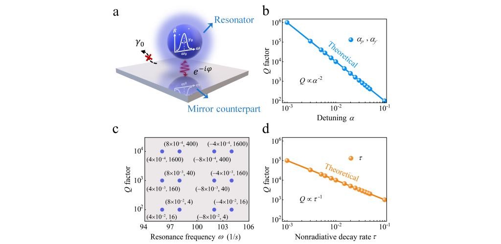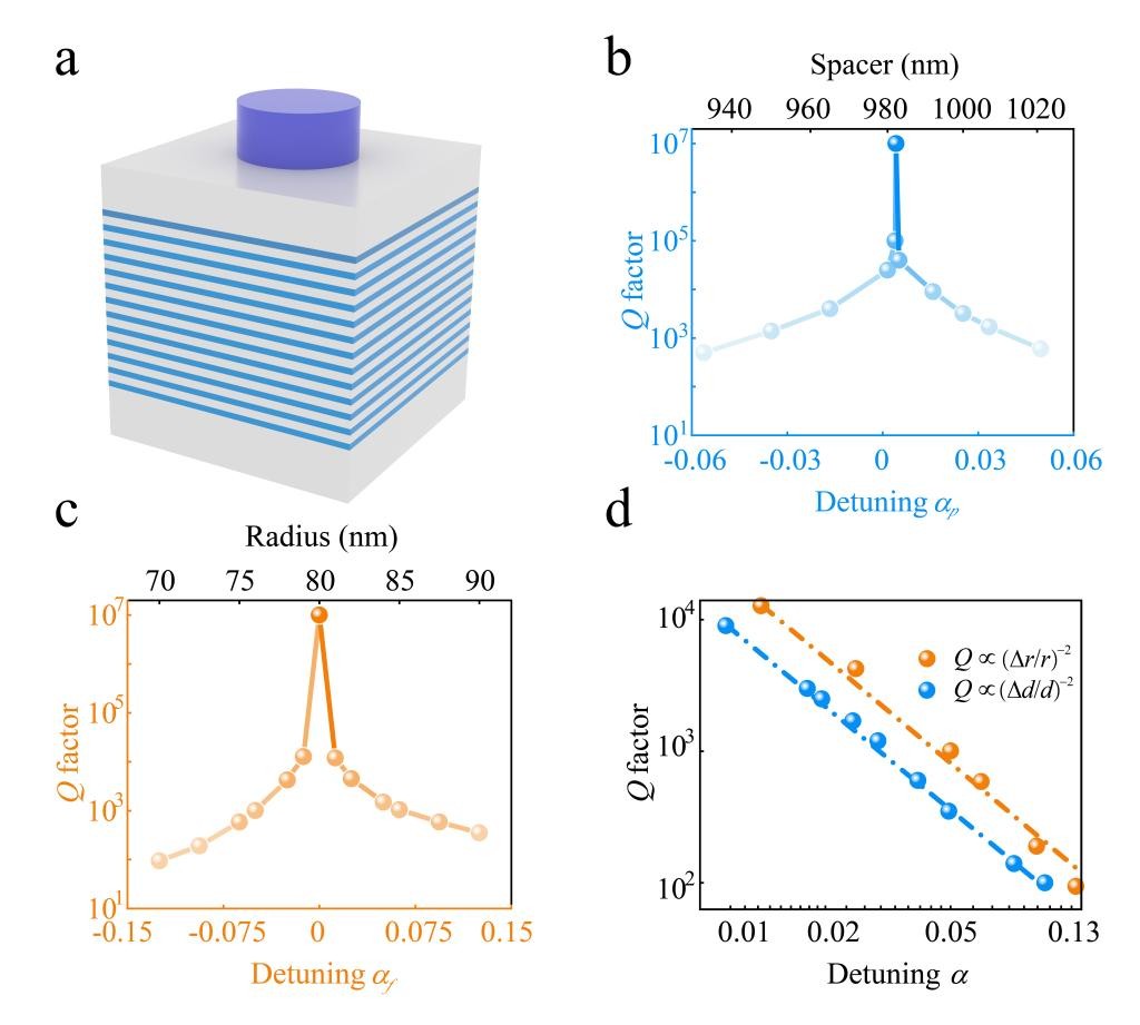 鉴于此,taptap网页版登录kino物理科学与工程学院王占山和程鑫彬团队联合中国计量科学研究院屈继峰研究员,提出了一种层间耦合谐振子模型(图1a),从理论上严格推导了FP-BICs在微扰作用下的Q因子的演化规律,揭示了Q因子与相位失谐和频率失谐的平方成反比(图1b),同时又和非辐射衰减率成反比的理论规律(图1d),从而实现了FP-BICs谐振的定向工程(图1c)。进一步地,通过引入由超表面和多层膜组成的多层膜超表面,诱导产生了FP-BICs(图2a)并验证了理论的准确性。这种构型依赖于由超表面实现的光学谐振器与由多层膜实现的完美镜像对应物之间的耦合,通过改变间隔层模拟相位失谐(图2b),改变超表面单元半径模拟频率失谐(图2c),最终拟合结果表现出了与理论结果良好的一致性(图2d)。