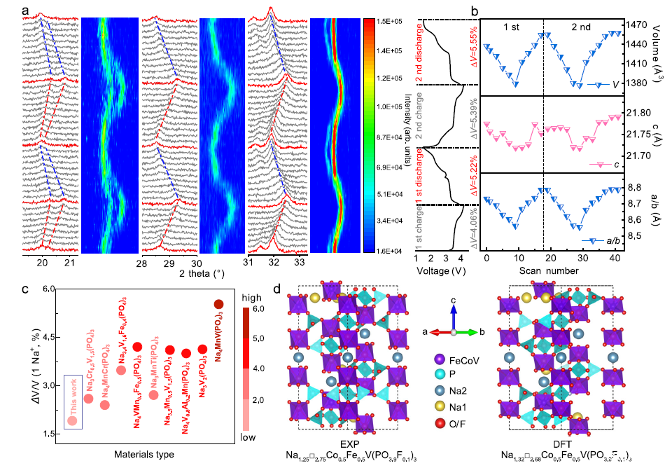 马吉伟团队通过同步辐射X射线吸收谱和固态核磁谱等先进表征手段,解析了氟掺杂诱导缺陷生成及位点的储钠机理。氟原子取代部分氧原子后,不仅稳定了晶体框架结构,更通过电荷重分布激活了储钠位点,增加了离子传输通道截面,激活了钠离子的储存比容量。并通过结构稳定和动力学优化,改善了正极材料在高电压区间的循环稳定性,实现了长循环寿命。