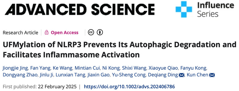 近日,taptap网页版登录kino生命科学与技术学院陈坤教授团队在《先进科学》(Advanced Science)杂志上发表题为“UFMylation of NLRP3 Prevents Its Autophagic Degradation and Facilitates Inflammasome Activation”的研究论文,首次揭示了犹素化(UFMylation)这一新型蛋白质翻译后修饰在NLRP3炎症小体活化中的核心调控作用。该新型蛋白质翻译后可以防止NLRP3蛋白错误折叠导致的自噬降解,从而维持其稳定,促进炎症小体的活化。该研究不仅拓展了犹素化修饰的生物学功能范畴,更为炎症性疾病的治疗提供了全新的干预靶点。