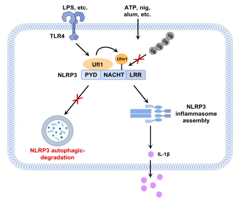 犹素化是一种类泛素化修饰,由UFM1(Ubiquitin-fold modifier 1)蛋白通过酶促级联反应共价结合到底物蛋白上,从而调控其活性、稳定性及亚细胞定位。该研究首次鉴定NLRP3蛋白为犹素化修饰的新底物,并阐明其修饰机制:犹素化E3连接酶Ufl1特异性识别并结合NLRP3蛋白,催化UFM1共价连接至NLRP3分子表面。该修饰抑制NLRP3发生K63连接的多聚泛素化修饰,从而阻断了NLRP3的自噬降解途径。犹素化修饰通过维持NLRP3蛋白的稳定性,为其寡聚化和炎症小体组装提供必要条件,最终促进IL-1β等促炎细胞因子的成熟与释放。