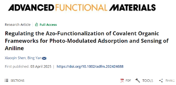 化学科学与工程学院闫冰团队设计合成光控型偶氮功能化共价有机框架用于对苯胺的高效吸附与检测,成果发表于《先进功能材料》